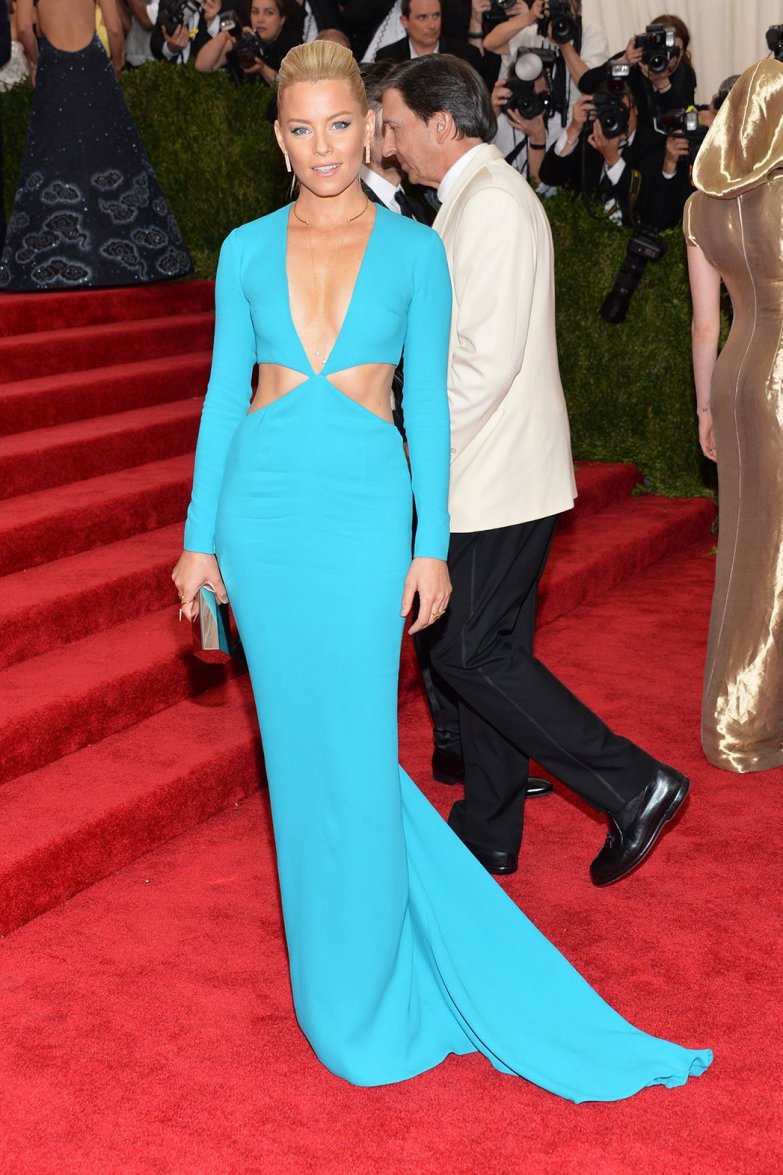 Elizabeth Banks in a turquoise cut-out long sleeve gown by Michael Kors at the 2015 Met Gala. 01.