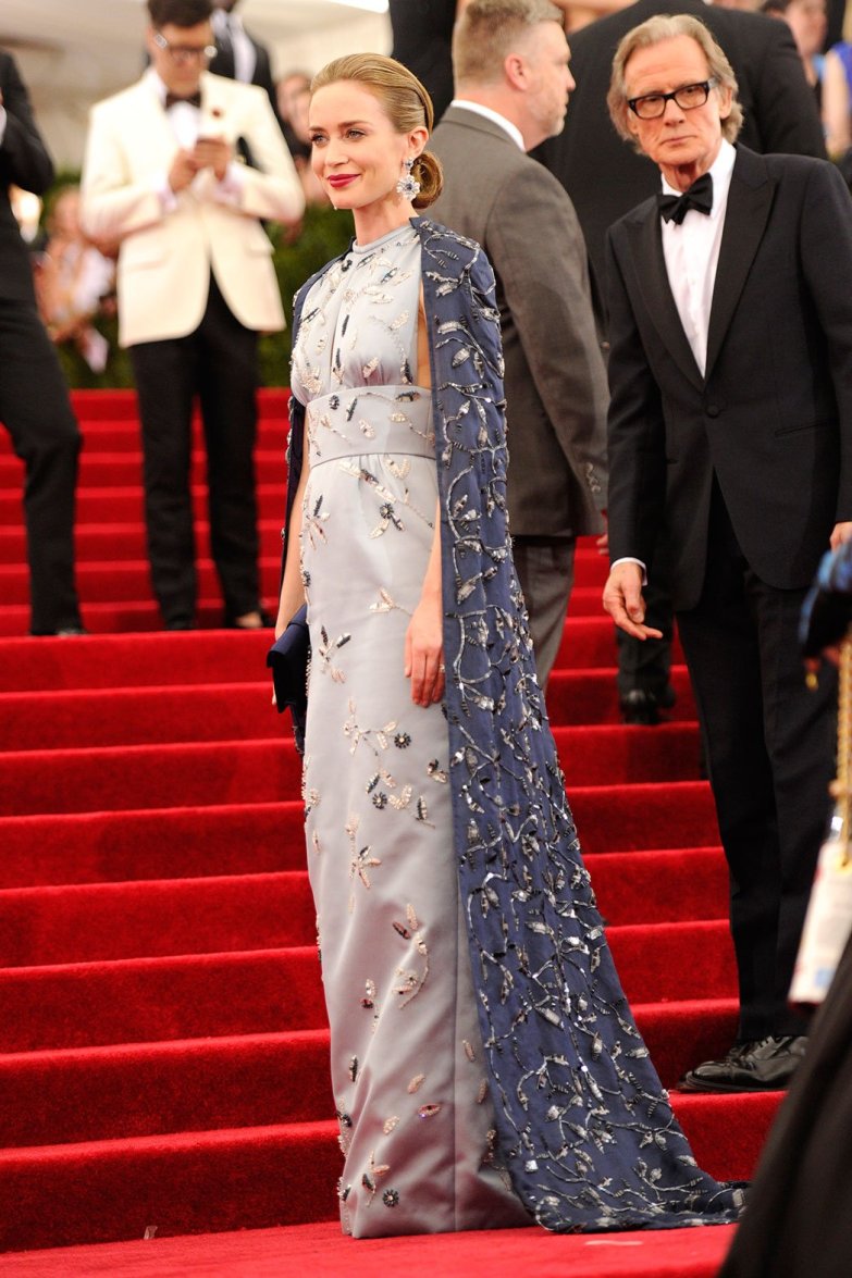 Emily Blunt in a steel blue Prada duchesse gown with glass bead emrboidery, a navy Prada clutch, & Christian Louboutin evening sandals at the 2015 Met Gala. 01.