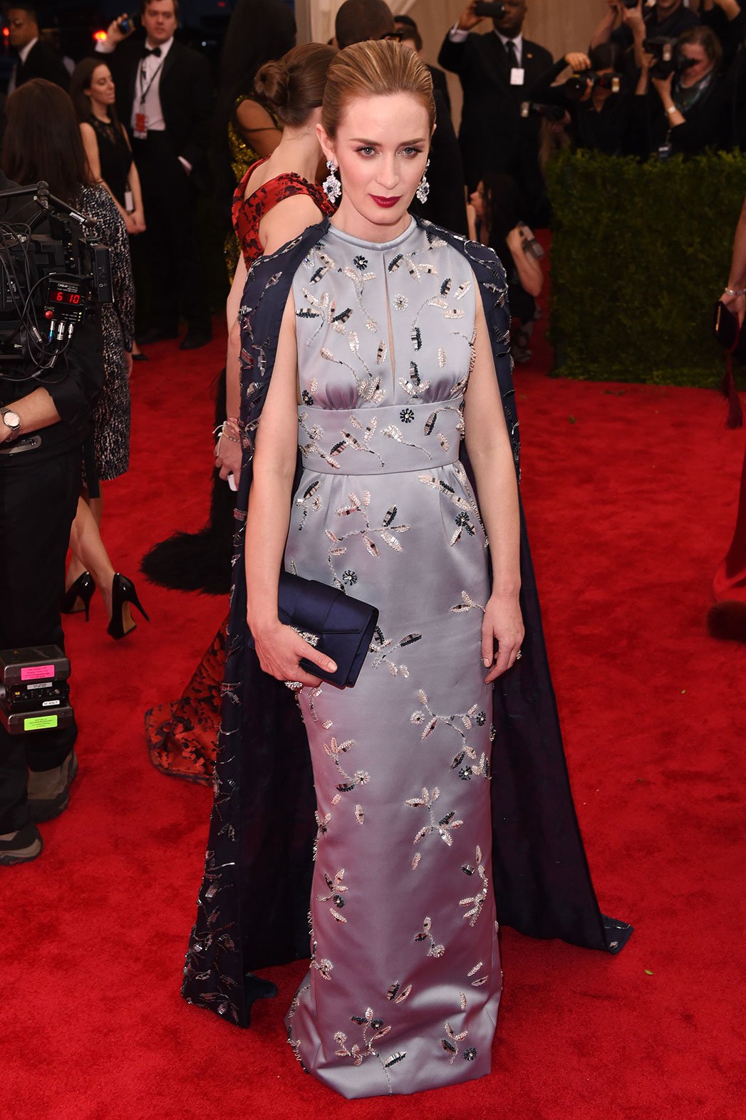 Emily Blunt in a steel blue Prada duchesse gown with glass bead emrboidery, a navy Prada clutch, & Christian Louboutin evening sandals at the 2015 Met Gala. 02.