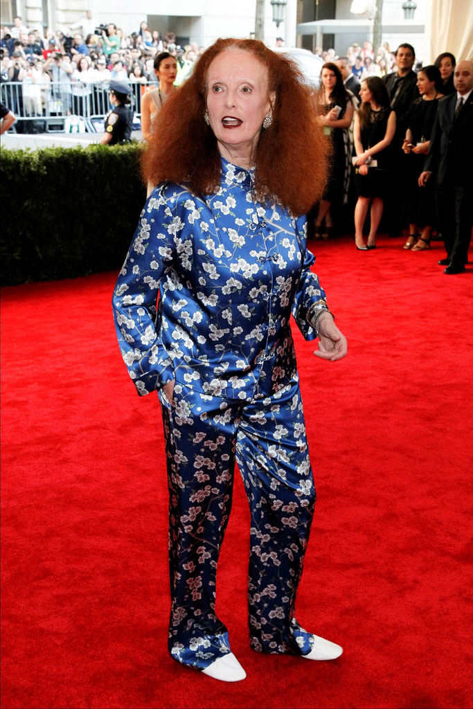 Grace Coddington in a silk embroidered set at the 2015 Met Gala. 01.