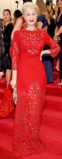 Helen Mirren in a red lace Dolce & Gabbana dress at the 2015 Met Gala. 01.