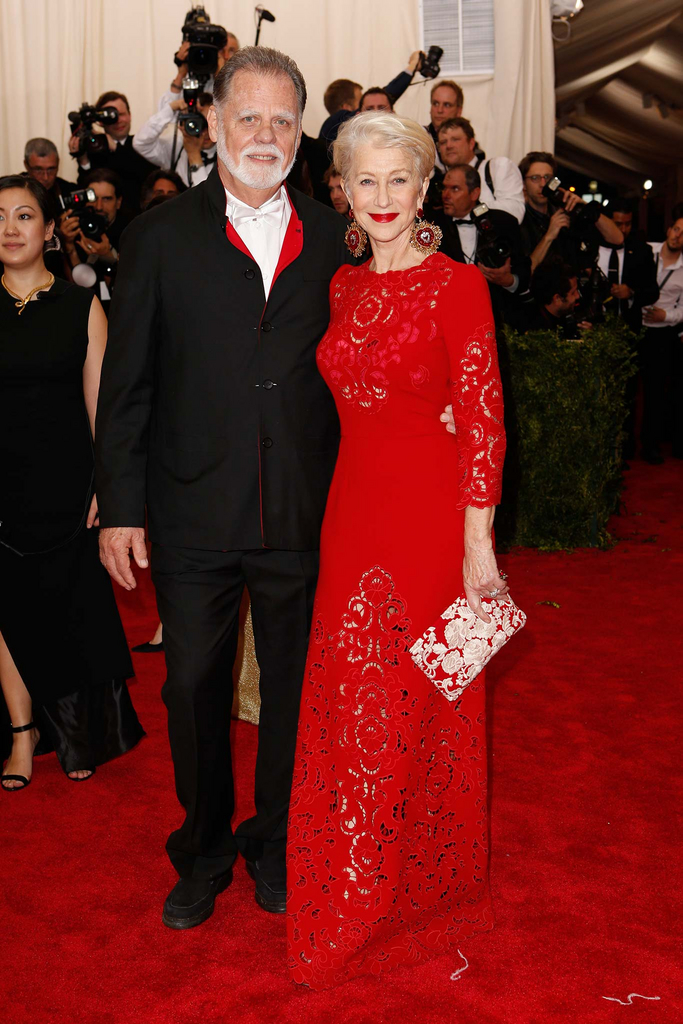 Helen Mirren in a red lace Dolce & Gabbana dress & Taylor Hackford at the 2015 Met Gala. 01.