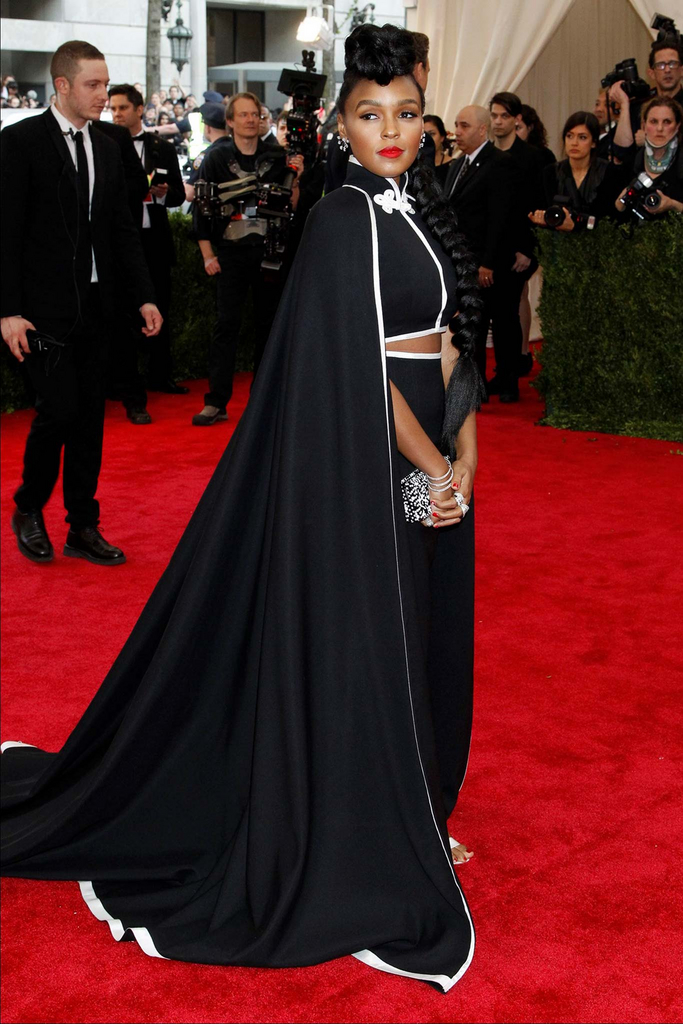 Janelle Monae in a black custom H&M cape look at the 2015 Met Gala. 02.