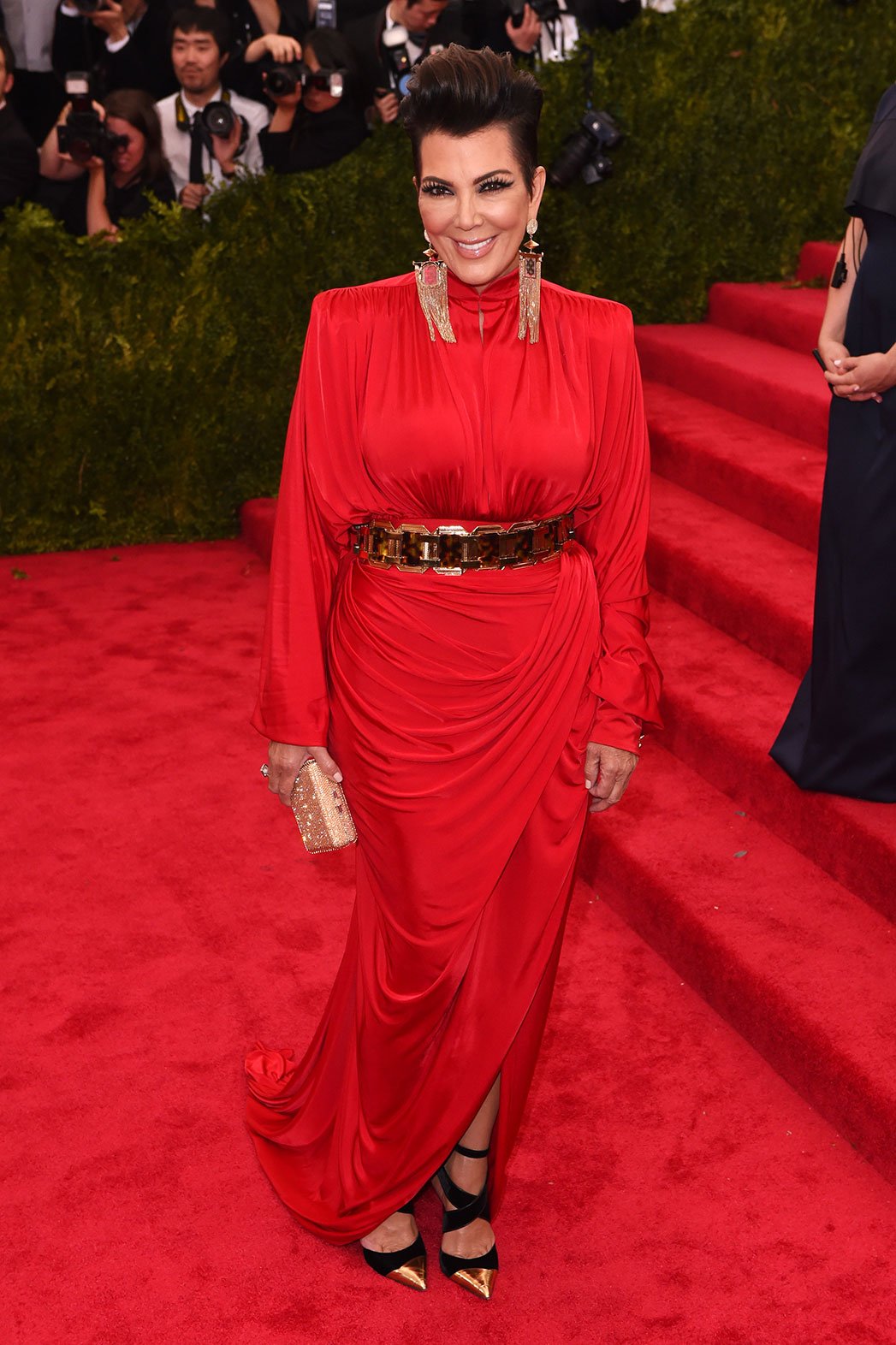 Kris Jenner in a red belted Balmain designer at the 2015 Met Gala. 01.