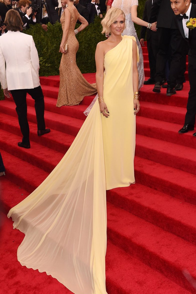 Kristen Wiig in a pale yellow chiffon gown by Prabal Gurung at the 2015 Met Gala. 01.