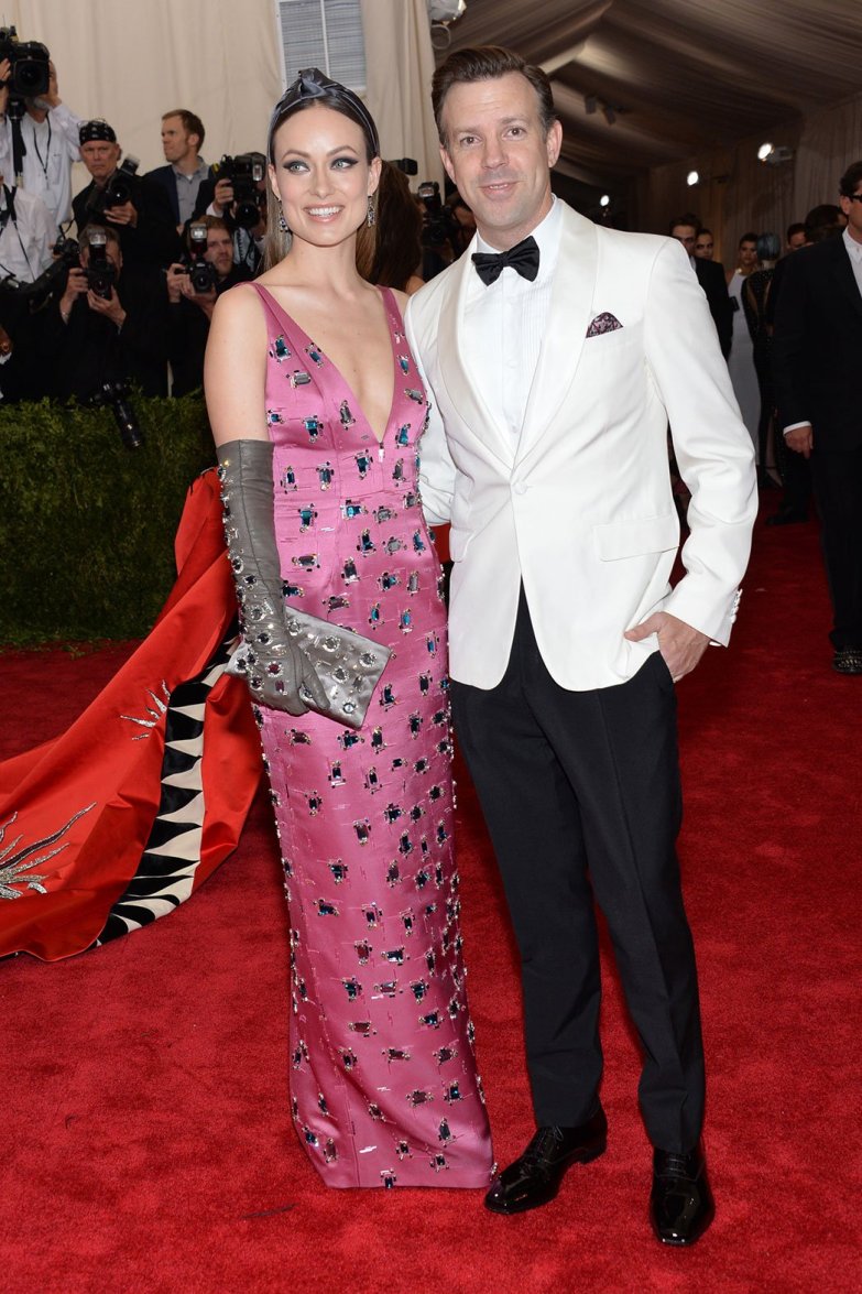Olivia Wilde in a pink embellished & embroidered Prada column gown & Jason Sudeikis at the 2015 Met Gala. 01.