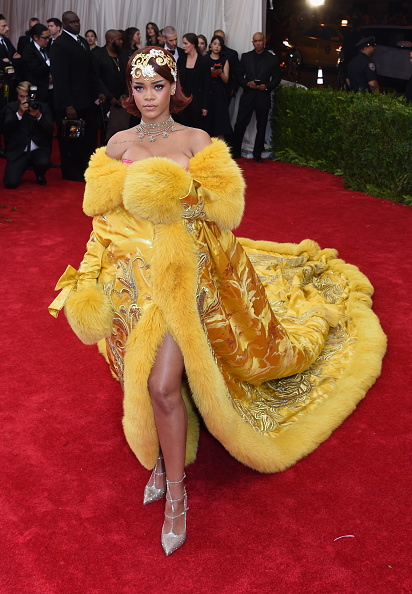 Rihanna in a gold silk & fur couture design from Guo Pei with jewelry by Cartier at the 2015 Met Gala. 01.