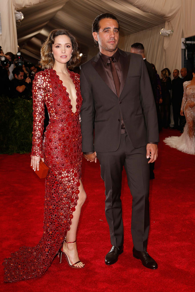 Rose Byrne in a red lasercut deep-v Calvin Klein Collection dress & Bobby Cannavale at the 2015 Met Gala. 01.