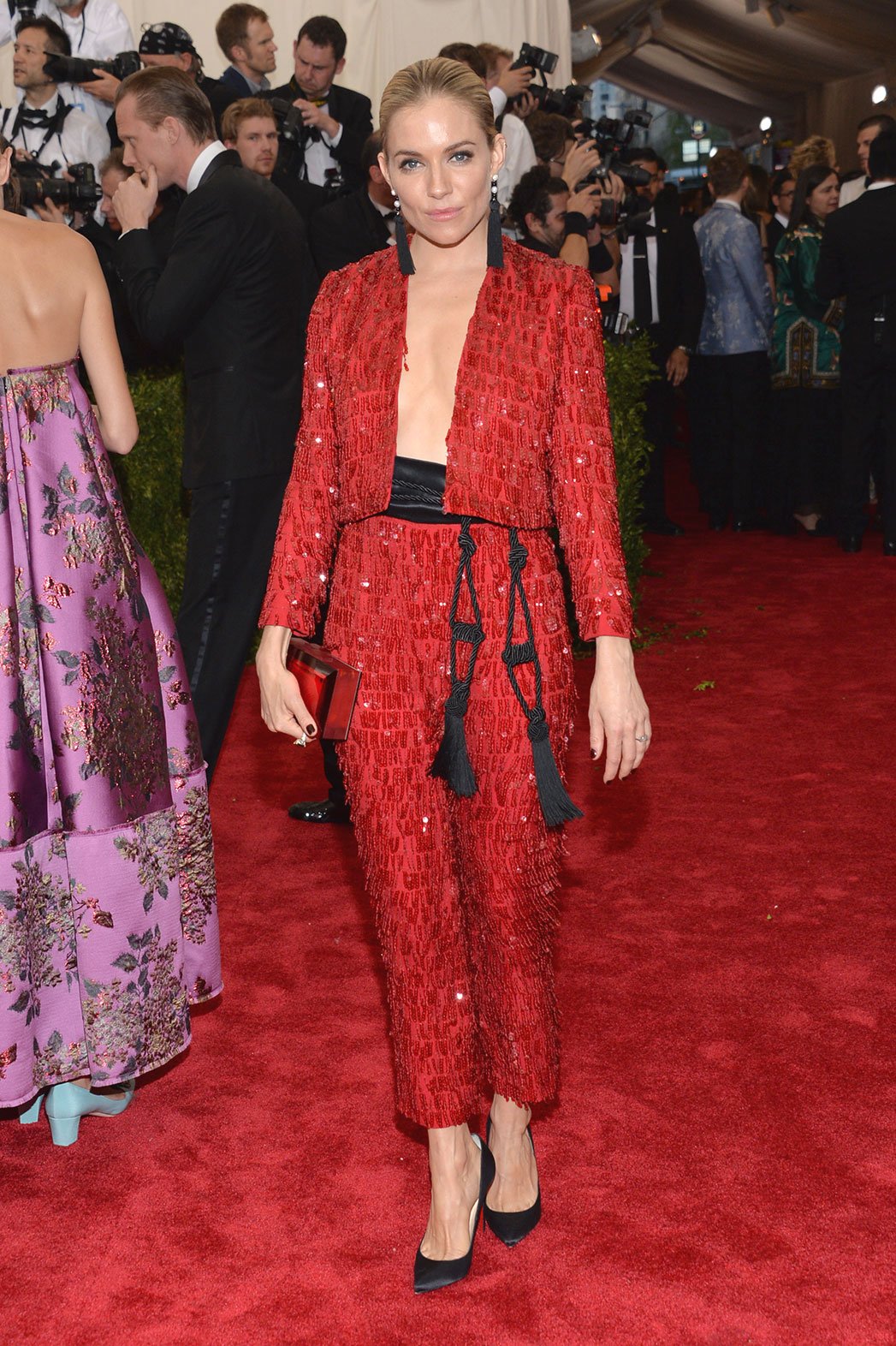 Sienna Miller in a red chiffon, fringe, & sequined tuxedo by Thakoon with silk tassel earrings by Jacob & Co. at the 2015 Met Gala. 01.