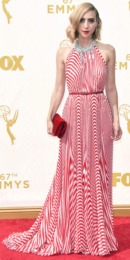 Zoe Kazan in a geo-patterned red & white belted dress with a matching red clutch.