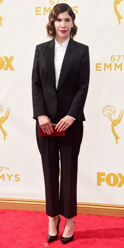 Carrie Brownstein in a black pantsuit by Stella McCartney.