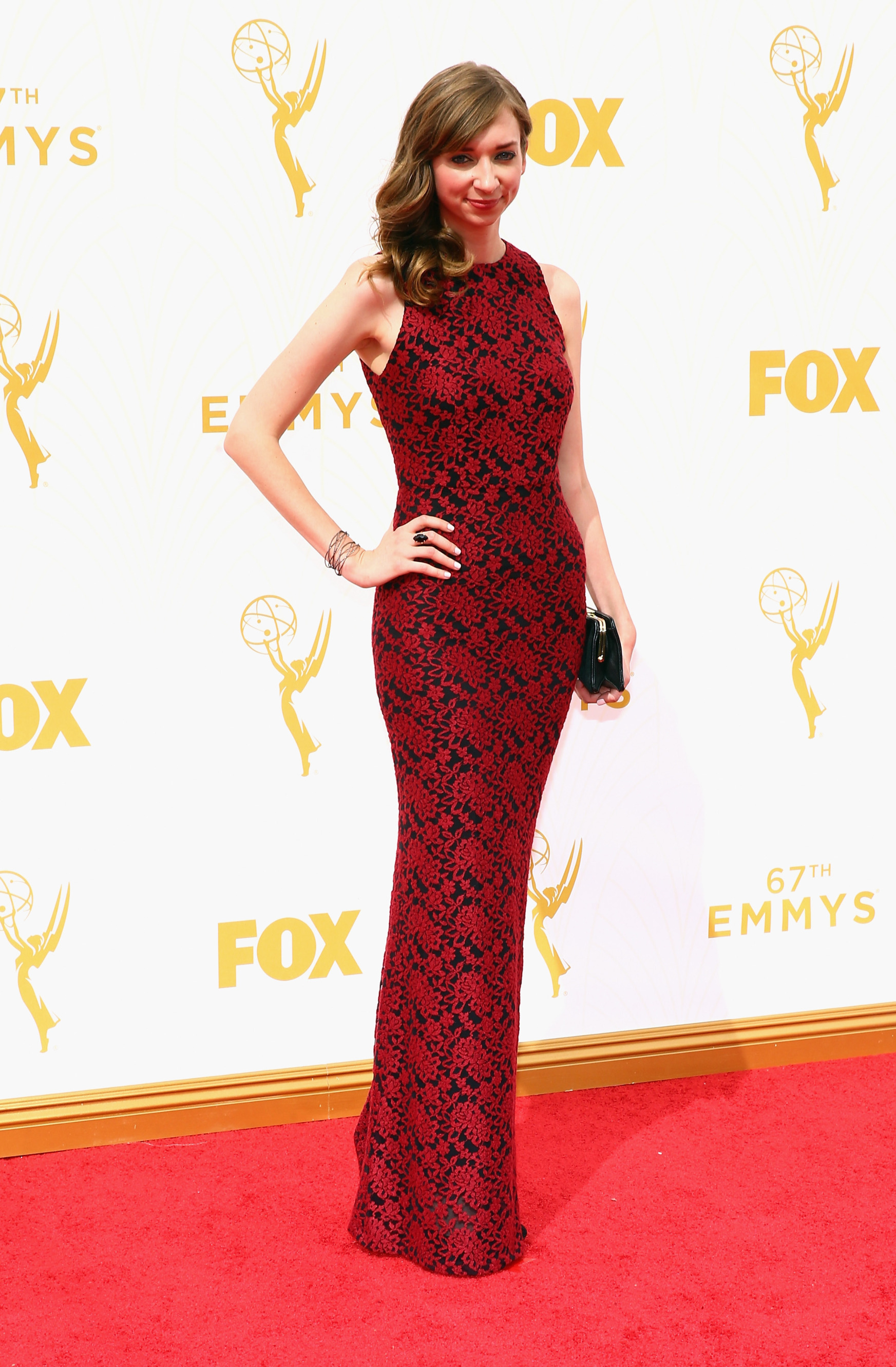 Lauren Lapkus in a red & black lace column gown.