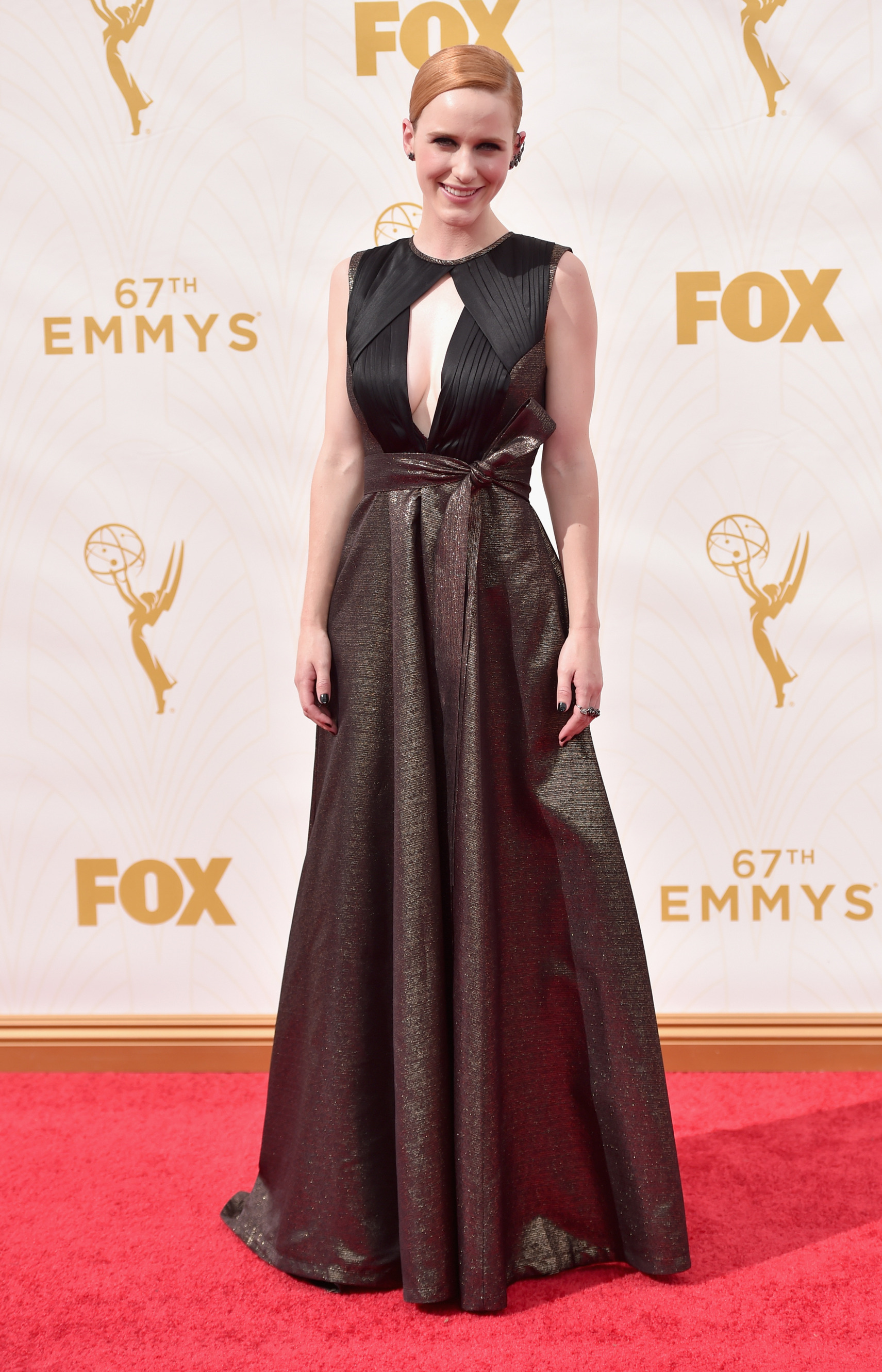 Rachel Brosnahan in a black & gold gown.