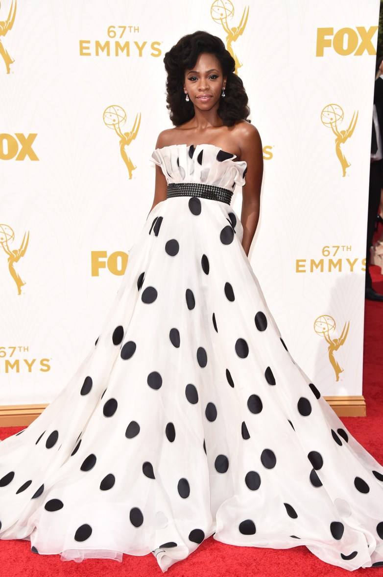 Teyonah Parris in a dramatic white & black polka dot ball gown.