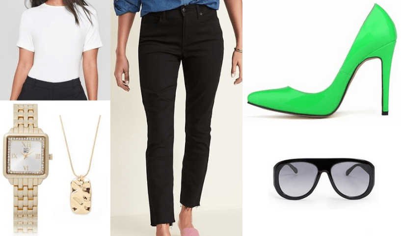 SHOP: Prologue short sleeve crew neck tee @Target (available in XS-XXL), black straight jeans @Old Navy (available in 0-20), neon green high heels @Stylentol, ASOS DESIGN clutch @ASOS, tinted sunglasses @Forever 21, hammered pendant necklace @Forever 21, & gold pave square link watch @New York & Company.
