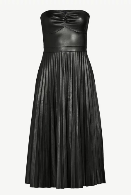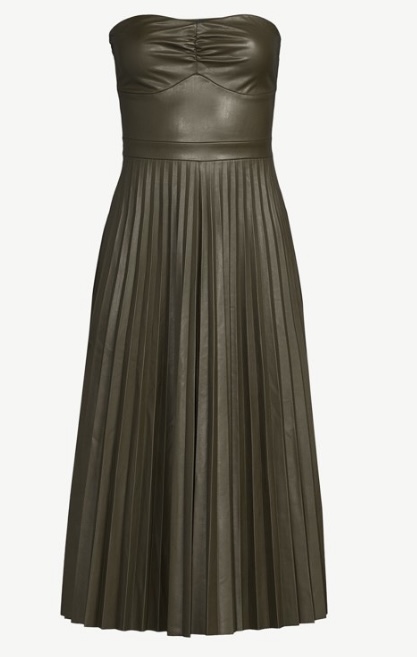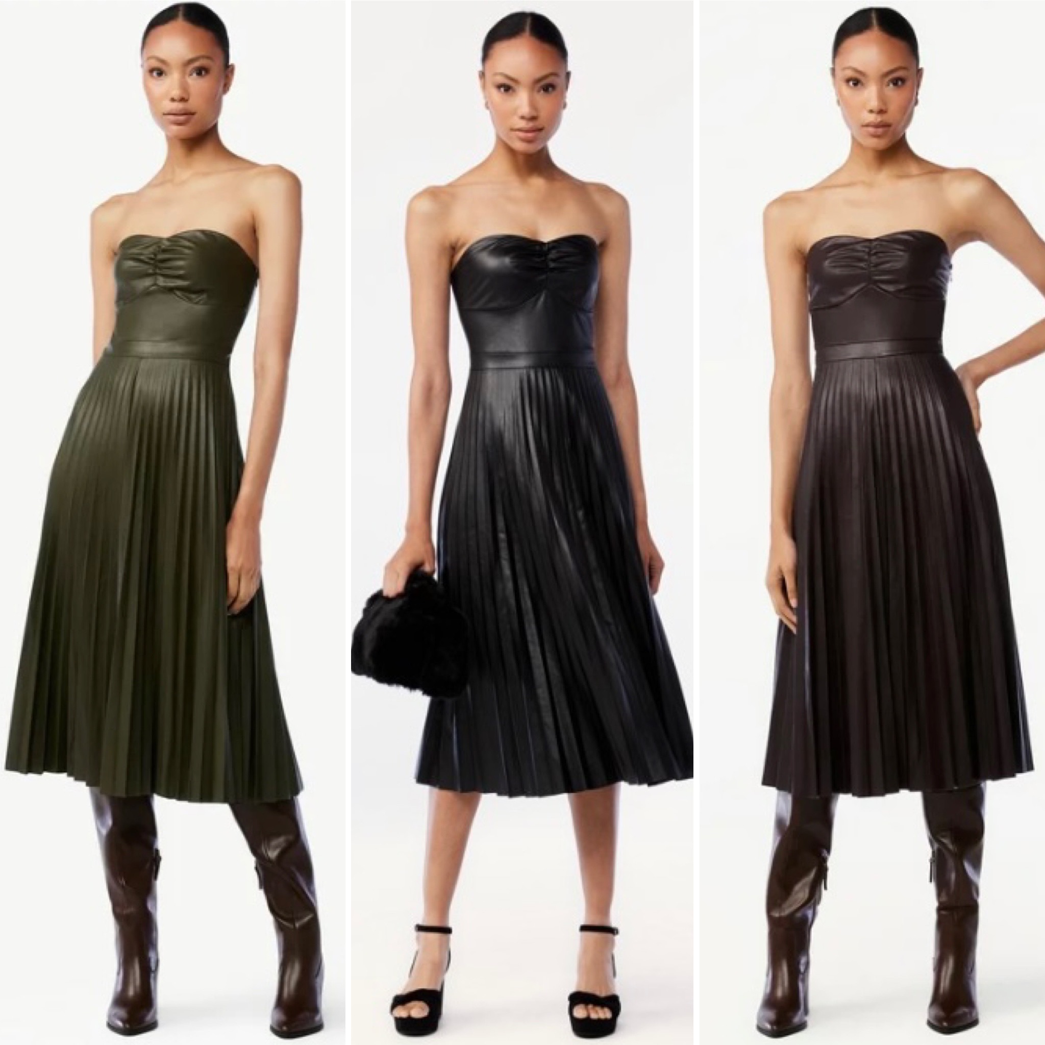 Scoop’s faux leather pleated strapless midi dress in black, olive, or aubergine @Walmart ($54.00, available in sizes XS-XXL) is a machine washable polyester-spandex must-have piece in a timeless length to wear all year long—for real. The sweetheart neckline, A-line silhouette, & pleated midi skirt scream feminine, but juxtapose with an edgy look from the fabric.