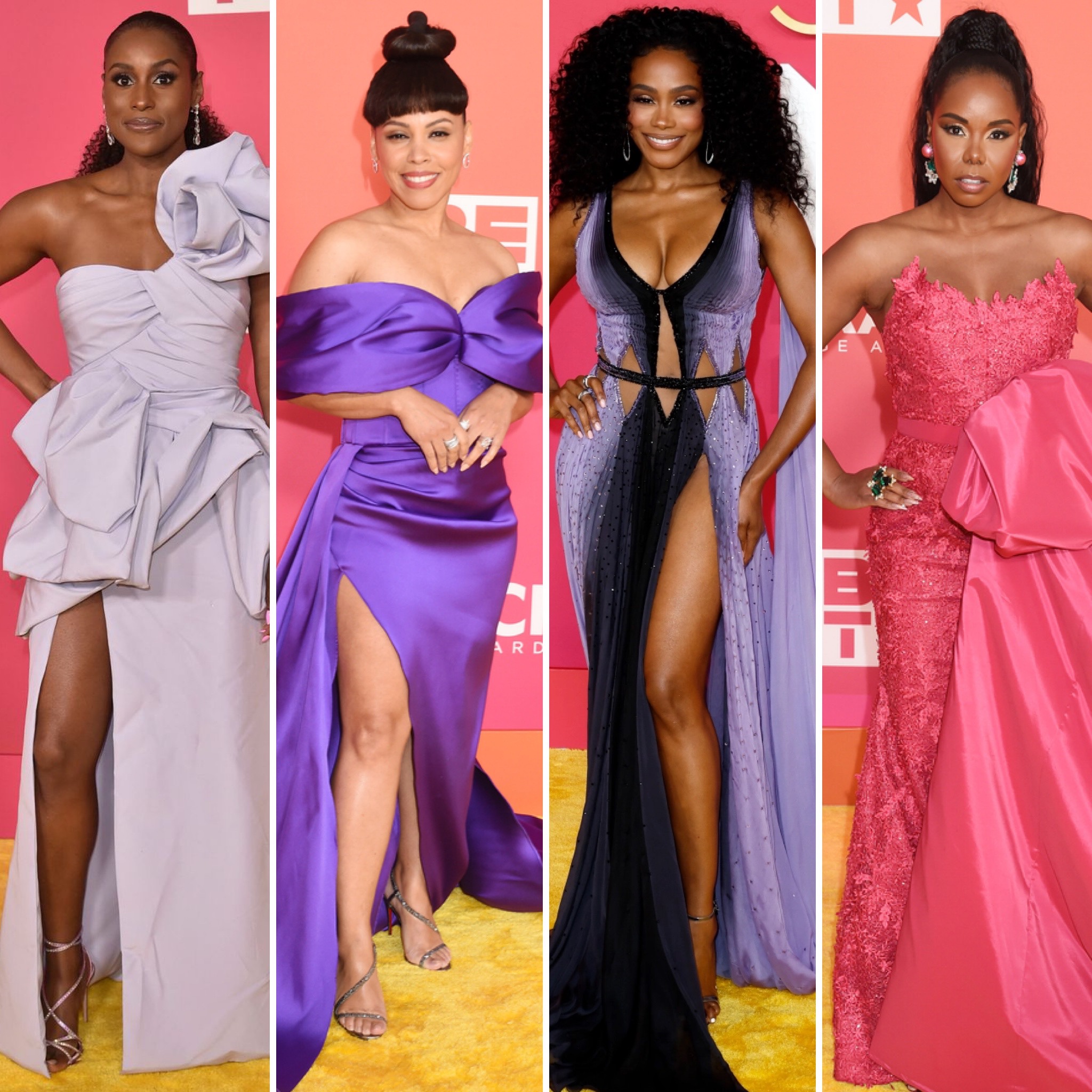 Issa Rae in a lavender one-shoulder dress, Amirah Vann in a purple off-shoulder gown, Shannon Thornton in a black & purple embellished gown, & Erica Cobb in a pink floral embellished gown at the 2023 NAACP Image Awards