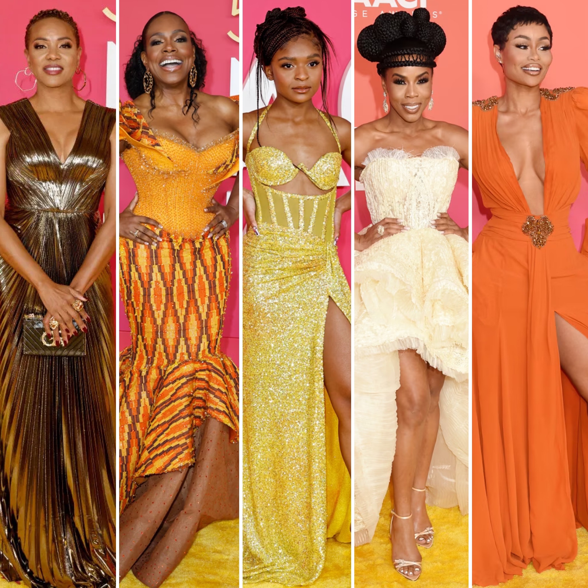 MC Lyte in a gold pleated gown, Sheryl Lee Ralph tribal gown by Pistis, Dominique Thorne in a gold beaded gown, Brandee Evans in a cream hi-low ball gown, & Blac Chyna in an orange deep-v gown at the 2023 NAACP Image Awards