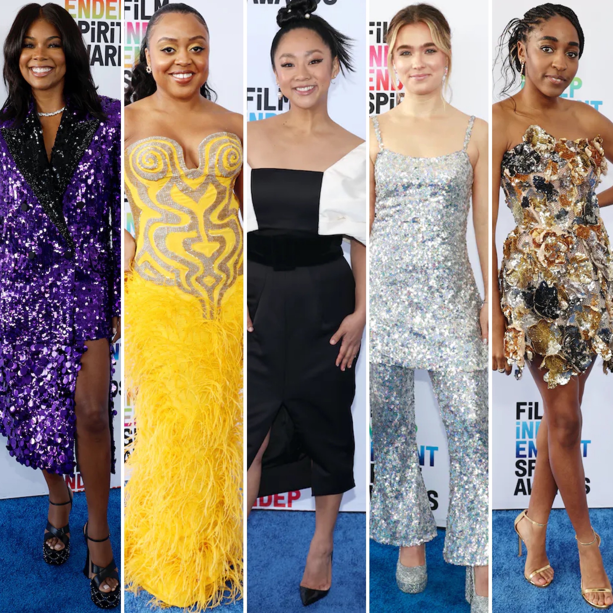 Independent films & new television programs had their well-deserved moment in the spotlight tonight at the 2023 Film Independent Spirit Awards. The passion for storytelling was the theme of the night; however, the red carpet sparkled plenty of jaw-dropping style that on this season’s favorites, including nominee Gabrielle Union in a purple shimmering Gucci mini dress, The White Lotus star Haley Lu Richardson in a silver bell-bottom ensemble, Women Talking actress Claire Foy in a Carolina Herrera design, the extraordinary Jodie Turner-Smith in a feathered Elie Saab Haute Couture number, Abbott Elementary creator Quinta Brunson in yellow mermaid dress by Aliétte, & Till lead Danielle Deadwyler in Chanel.