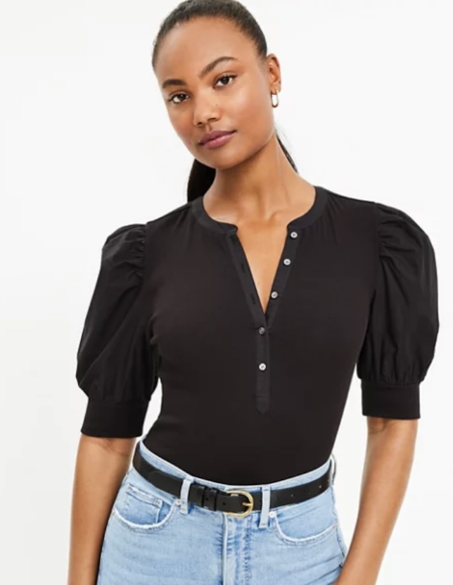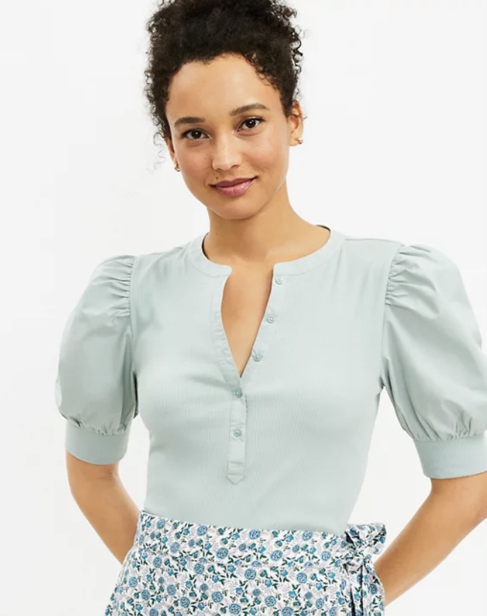 SHOP: puff sleeve mixed media top in Palm Springs Pink, Agave, & Black @LOFT (on sale: $29.97, available in sizes XXS-XXL).