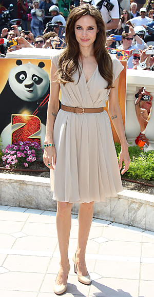 Published May 14, 2011 at 300 × 580 in Angelina Jolie in a beige chiffon dress with a letaher belt & pumps by Salvatore Ferragamo