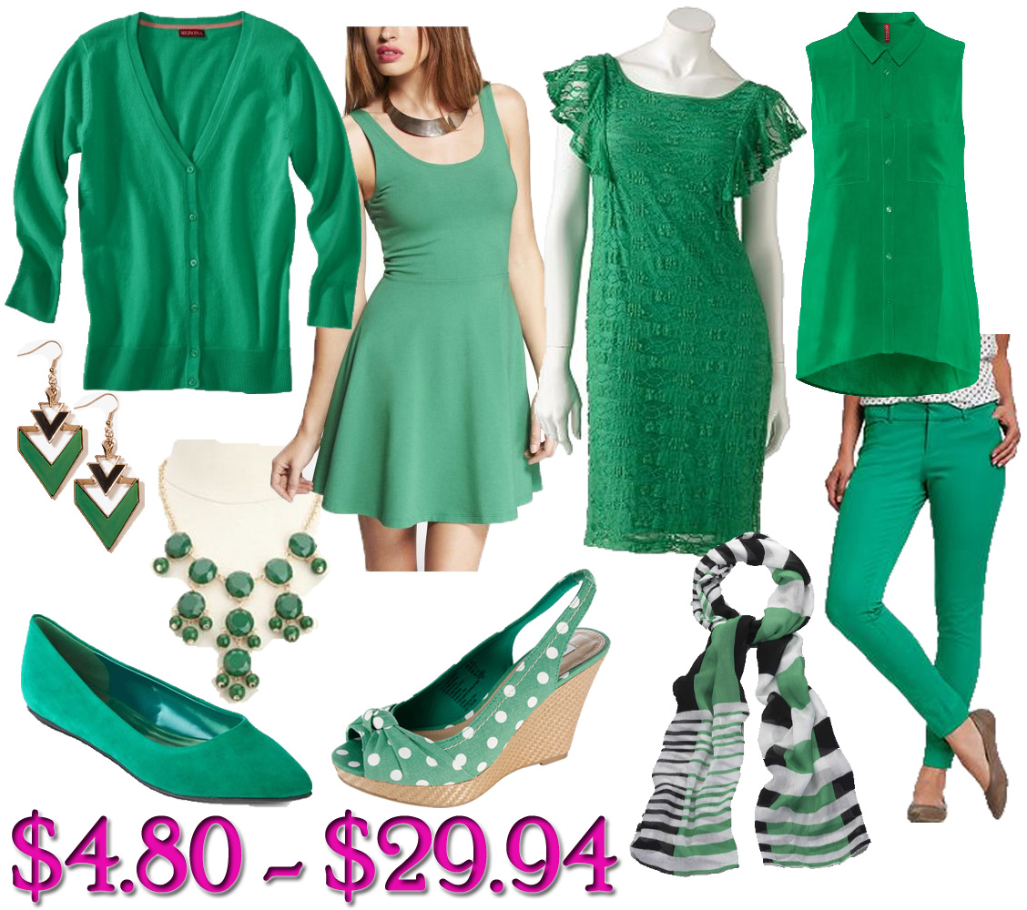 How do you like to wear green? Do you wear green on St. Patrick’s Day? Which are your favorite pieces? What’s your budget for new spring-friendly fashions? For more posts on affordable fashion, check out a budget-friendly spring look for under $100, the complete lookbook of Kate Young’s collection for Target, colorful crossbody bags for under $15.00, neon looks inspired by Beyoncé Knowles & Jennifer Lopez, chic spring break must-haves, & how to wear yellow like Emmy Rossum & Miranda Kerr! Happy Styling!
