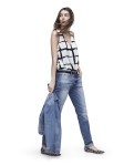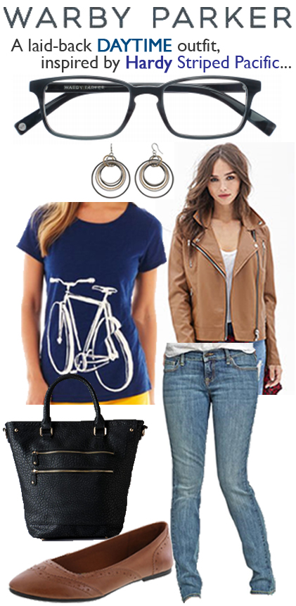 My first outfit can be easily recreated with basic wardrobe staples so that the Hardy frames in striped pacific can be the star player. Keeping a budget in mind, I choose a short-sleeve bike graphic tee ($14.99) in blue from JC Penney & Old Navy‘s flirt skinny jean ($22.00) in eyre. To top off the look, I love the luxe feel of the zippered faux leather moto jacket ($24.80) in camel from Forever 21. Additional accessories to finish off the outfit include the American Eagle ‘Boulevard’ brogue flat ($16.99) in cognac from Payless, Freemont zipper tote ($29.98) in black from Francesca’s, & the Jennifer Lopez textured concentric hoop drop earrings ($13.50) from Kohl’s.