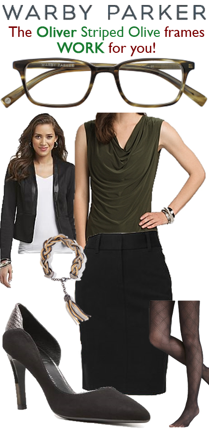 For a professional & polished look when headed to work, I immediately thought of the Oliver frames in striped olive. The hue is spot-on for fall, & perfect for coordinating with neutrals like black, navy, chocolate, & charcoal. I was excited to style these frames with Dress Barn‘s solid cowl neck tank ($19.50) in olive, Jaclyn Smith’s tuxedo style knit jacket ($13.99) in black onyx from KMart, LOFT‘s ponte trouser pencil skirt ($69.50) in black, & DSW‘s Franco Sarto ‘Mumba’ pump ($29.94) in black.
