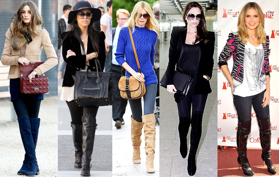 As I usually do in my Basics for a Bargain posts, let’s start off with some celebrity inspiration to see how some of the most photographed & stylish stars interpret their over-the-knee boot looks. The City star / socialite Olivia Palermo looks Upper East Side chic with her navy suede boots & fur-lined jacket, mixing neutrals with a sweater tunic. Mom-on-the-go Kourtney Kardashian wears her boots with a flowy blouse under a menswear-inspired blazer & floppy hat, keeping accessories like her bag matching in texture with her footwear. Supermodel legend Claudia Schiffer goes casual in jeggings & a cobalt cable knit sweater with a coordinating bag for her tan suede over-the-knee boots. Former Spice Girl / designer Victoria Beckham keeps her polished posh persona in check with ultra tight leggings, a black top, & satin-trimmed blazer while traveling through Heathrow airport. Lastly, Project Runway host Heidi Klum offers an edgy approach to her leather Jimmy Choo over-the-knee boots by completing her look with a graphic tee & abstract print blazer.