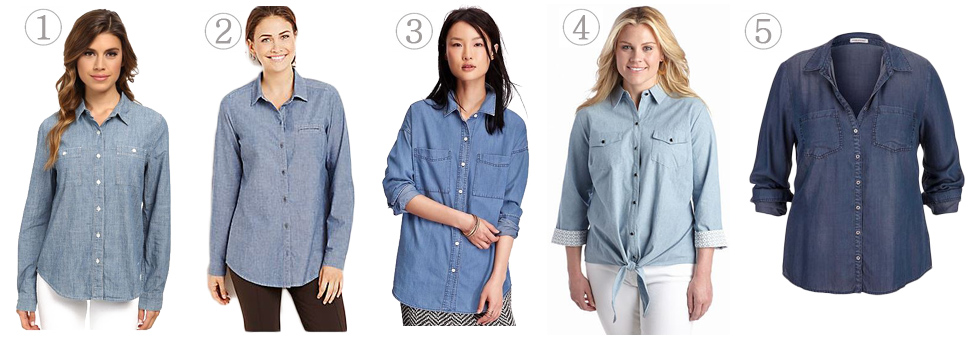 SHOP: 1. Dockers chambray shirt ($24.99, was $40.00) @6PM, 2. chambray shirt ($39.99, was $69.00) @J.Jill, 3. chambray shirt ($32.94) available in sizes XS – XXL @Old Navy, 4. New Directions plus size chambray shirt ($18.19, was 52.00) @Belk, & 5. plus size chambray shirt ($46.00) @Maurices.