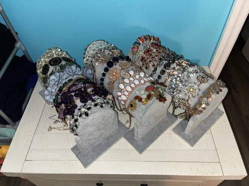 Now, nothing against headbands—which I don’t wear—but I wanted a way to display my statement necklaces in all of their sparkly glory. I ordered 3, not knowing exactly how many I needed, nor did I consider how much space the stands would take up as I began to sort through my jewelry. While I am only somewhat embarrassed to share that what is displayed below is a mere fraction of my statement necklaces, I am considering investing in a few more stands once the proper shelving is available in my cloffice.