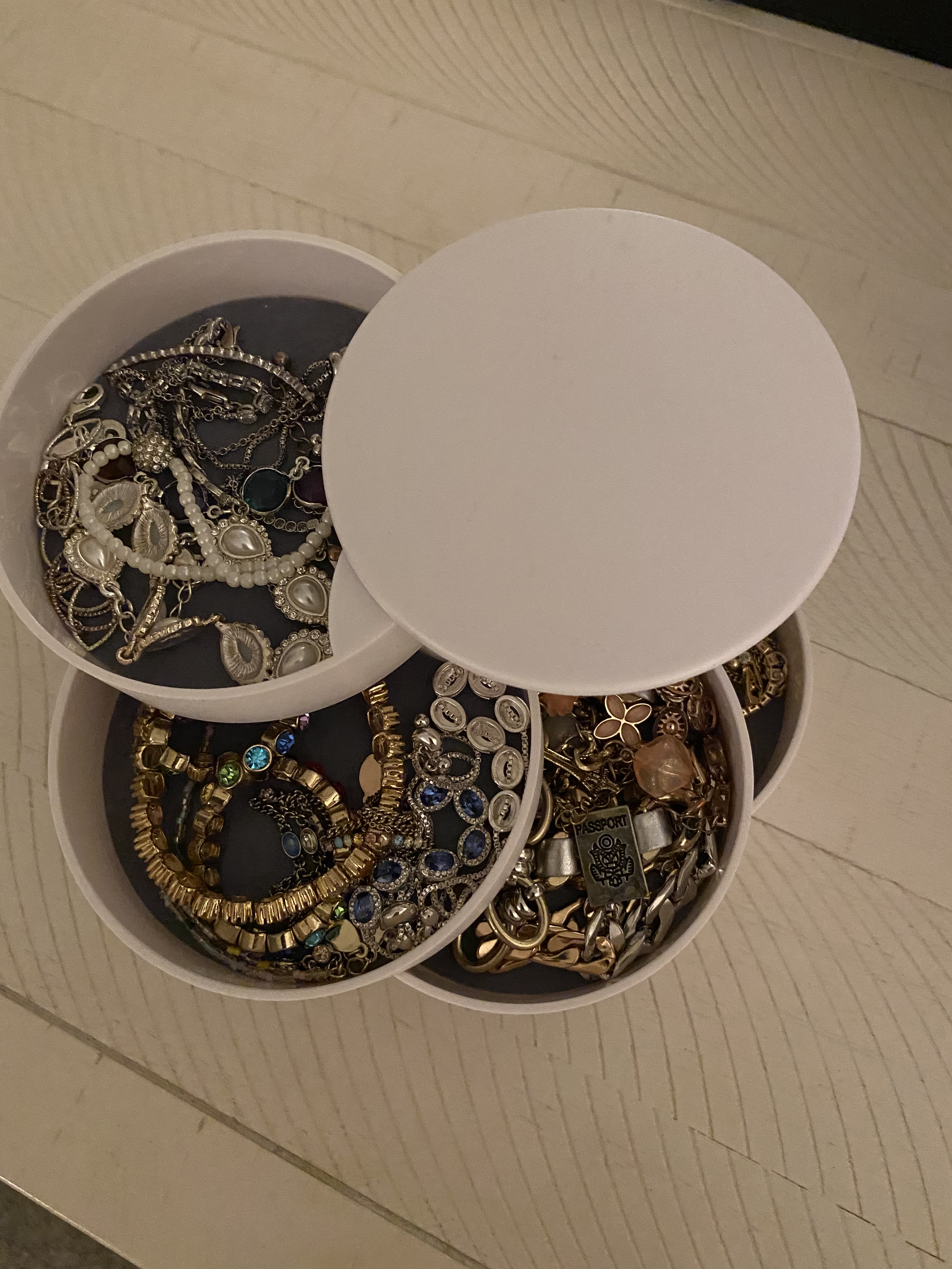 Drawer with stacked trays. I still have plans for the remaining space here with different clear trays & containers. Stack #1: silver short pendant necklaces on top. Stack #1 with 5 levels stacked, combining both the Walmart & Amazon trays. Stack #1: rose gold / silver necklaces.Stack #1: gold necklaces. Stack #1: more gold necklaces. Stack #1: older items from my younger days, like my nameplate, shell rings, multicolor stone charms, & dolphin pendants.Stack #2: silver bracelets. Stack #2 with 5 levels stacked, combining both the Walmart & Amazon trays.Stack #2: gold bracelets with charms & pendants.Stack #2: more gold bracelets with charms & pendants.Stack #2: gold bracelets with beads, charms, & pendants, along with my few pins.Stack #2: silver necklaces.