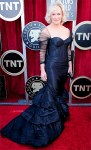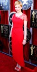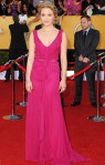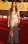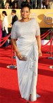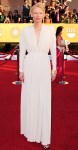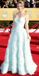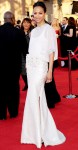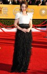 Also making a splash, especially with the menswear trend was Evan Rachel Wood who’s shown above a whopping four times, just like her Mildred Pierce co-star, Kate Winslet. She suited up in an outfit by Dolce & Gabbana with Salvatore Ferragamo houndstooth pumps (which I just drooled over on the Nordstrom website, for $950.00!). Then she brought new meaning to shirtdress with this flowing white Alessandra Rich design with jewel-studded black ankle strap heels. Then she returned to her black & white suit look, but with a vest over a feminine white blouse with some serious black Christian Louboutin pumps.