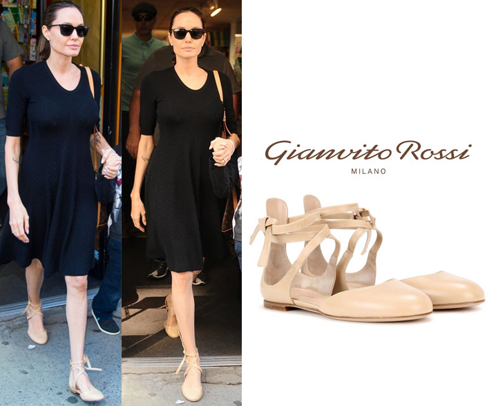 During one recent & busy night at work, I had a conversation with a lovely but frustrated customer for whom I was helping put an outfit together. Once a top & skirt found, our conversation turned to shoes. Of course, any kind of black pump (slingback, stiletto, or wedge) would make for a party-ready look, but then I suggested a nude shoe, which time and time again, has proved successful, especially when it comes to a summer ensemble. By now, you’re probably wondering what this anecdote has to do with the title of this post about. While I rely on a nude shoe as my go-to for many stylish summer outfits, my fashion world was rocked once more scrolling through social media, discovering that during a New York City day with her son, Knox, Angelina Jolie simplified a classic LBD-wayfarer shades look with nude ankle tie flats by Gianvito Rossi (shop here).