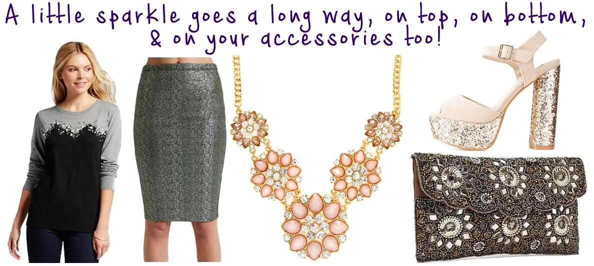 SHOP: embellished sweater @Target, glitter skirt @Wet Seal, statement necklace @Icing, glittery platforms @Charlotte Russe, & sequined satin clutch @Forever 21.