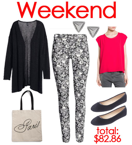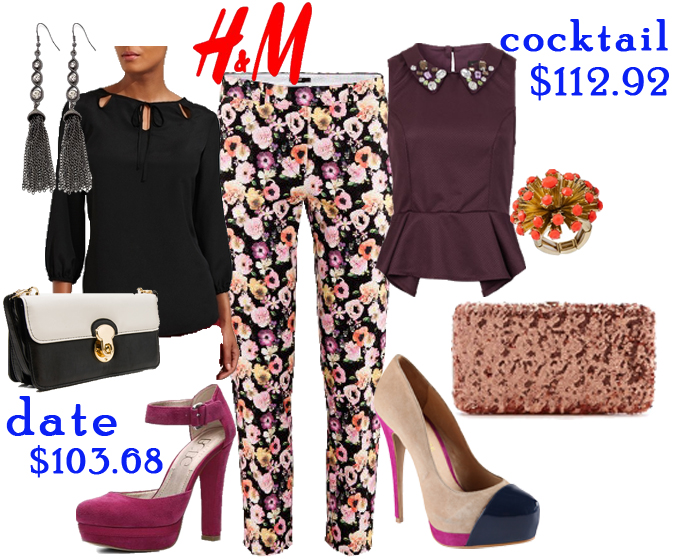When it comes to date night looks, you always have to consider where you’re headed.  Floral pants may seem busy, but if accessorized correctly, they’re the perfect foundation for a sophisticated & smart look to impress your date.  I picked the teardrop cut-out blouse ($24.99) in black from The Limited, a piece that is sure to make the rounds with other wardrobe staples like a pencil skirt, boyfriend jeans, & leggings.  Of course in skinny pants like these, a pair of DSW‘s BCBG Paris Preena pumps ($29.94) in fuchsia will elongate the legline & won’t be as intimidating as some seriously pointy toe shoes.  For a special finishing touch, I love the colorblocked flap crossbody ($19.80) from Forever 21 & Mixit hematite stone tassel drop earrings ($4.00) from JC Penney.