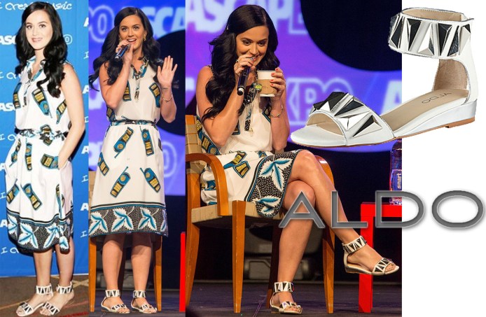 Katy Perry has been everywhere these days, promoting her upcoming film, The Smurfs 2. Along with hitting Europe & Mexico, Katy turned up in Los Angeles to the I Create Music Expo. The “Teenaged Dream” singer wore a cell phone-designed graphic print collared tank dress ($650.00) by Suno, as well as Kasota sandals ($80.00) from Aldo. While I think it’s a great idea for the pop star to don accessories from retailers that can be found in the local mall, $80 is still a pretty penny to spend on sandals. Surely this style can be worn with plenty of looks throughout the spring & summer, but I was really inspired to search for silver & white look-alikes to recreate Katy’s footwear choice, without breaking the bank.