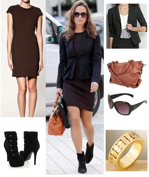 It was easy to find the next five items which really bring out Pippa’s figure & the edginess in the dress.  @Forever 21, the studded suedette ankle boots ($32.80) are just the wow factor needed to punch it up.  Also, the buckled leatherette handbag in brown ($34.80) is functional b/c of its adjustability.  There’s one sale that you can’t miss & that’s on the sunglasses like these ($3.99), which are marked down from $5.00.