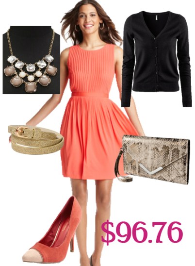 Finding more sale items to keep within out under $100 budget was easy since coral is such a feminine & bright color to wear for this holidays.  The rest of this look includes the cardigan ($17.95) in black from H&M which is the ultimate wardrobe staple for any embellished top or watercolor sheath dress.  Also, the glittered skinny waist belt ($3.80) in gold from Forever 21 is also available in pink, mint, & purple for your every pastel need.  The look comes together effortlessly with the color block pointed toe pump ($12.49) from Charlotte Russe that has a special metallic detail between the nude & coral hues.