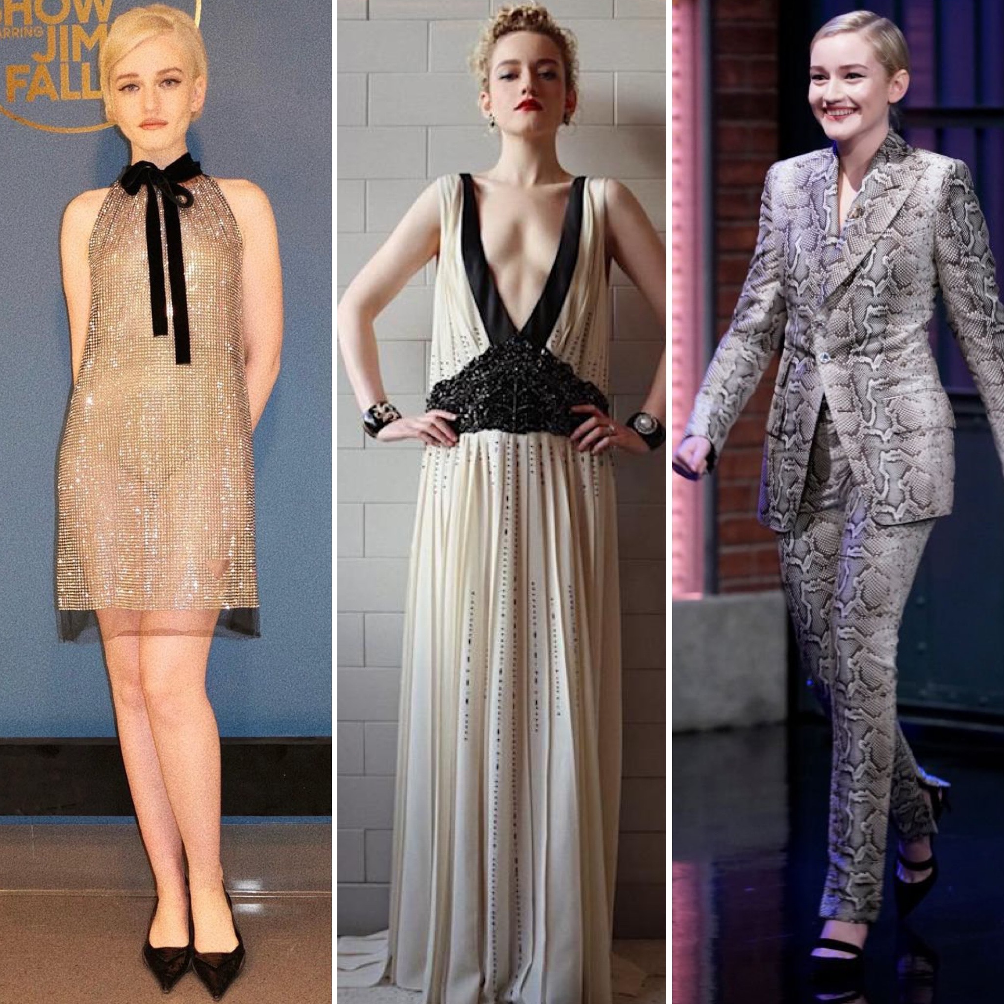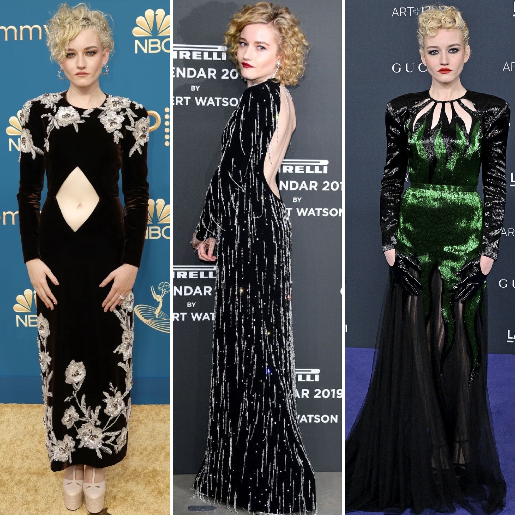 Designs by Alexandre Vauthier made a style statement at the Golden Globes since both supermodel Heidi Klum & Downton Abbey actress Michelle Dockery both donned looks, but I picked this leg-baring halter gown from the Spring 2013 Haute Couture Collection. J. Mendel‘s Pre-Fall 2013 Collection was a dreamy mixture of texture, detail, flowy fabrics, & strong silhouettes, including this lace-accented spaghetti strap gown with off-the-shoulder tiers. Also, Giambattista Valli‘s white & gold ball gown took my breath away from its Spring 2013 Haute Couture Collection & would certainly wow fashion critics if worn on Isla Fisher, Julianne Hough, or Kerry Washington.