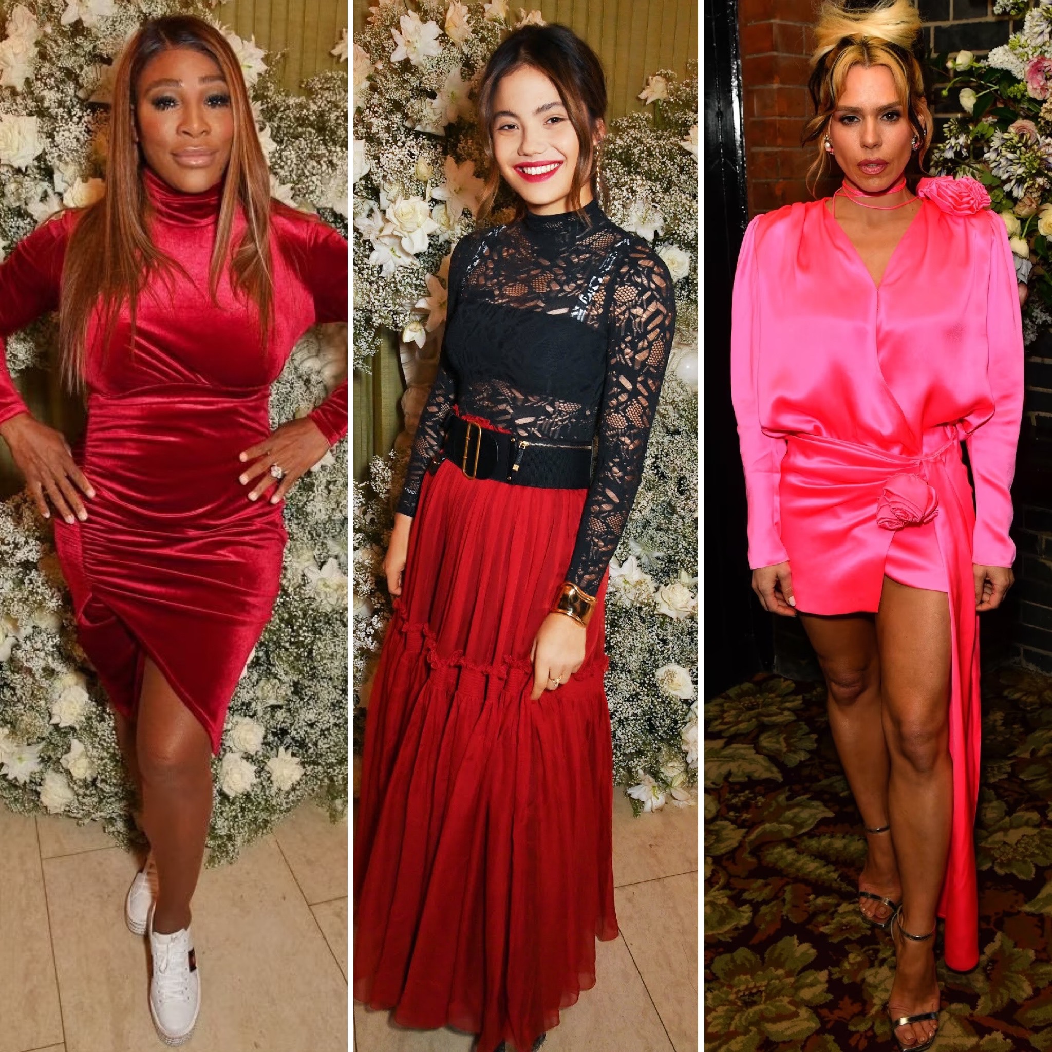 Serena Williams in a red velvet Gucci mini dress with trainers, Emma Raducanu in a Dior lace & skirt ensemble, & Billie Piper in a magenta shirt dress at a BAFTAs after party