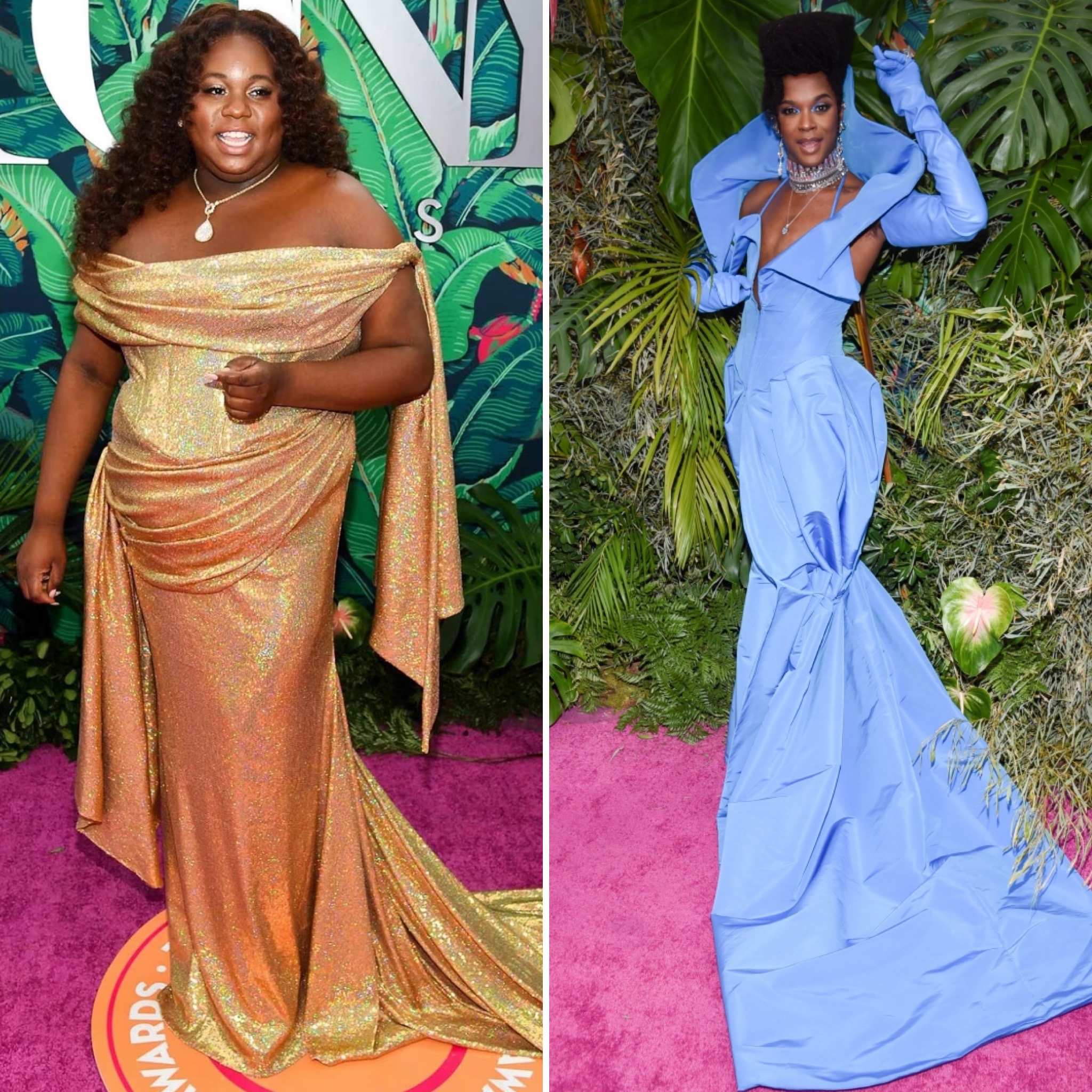 Alex Newell in a liquid gold gown & J. Harrison Ghee in a dramatic blue design at the 76th Annual Tony Awards