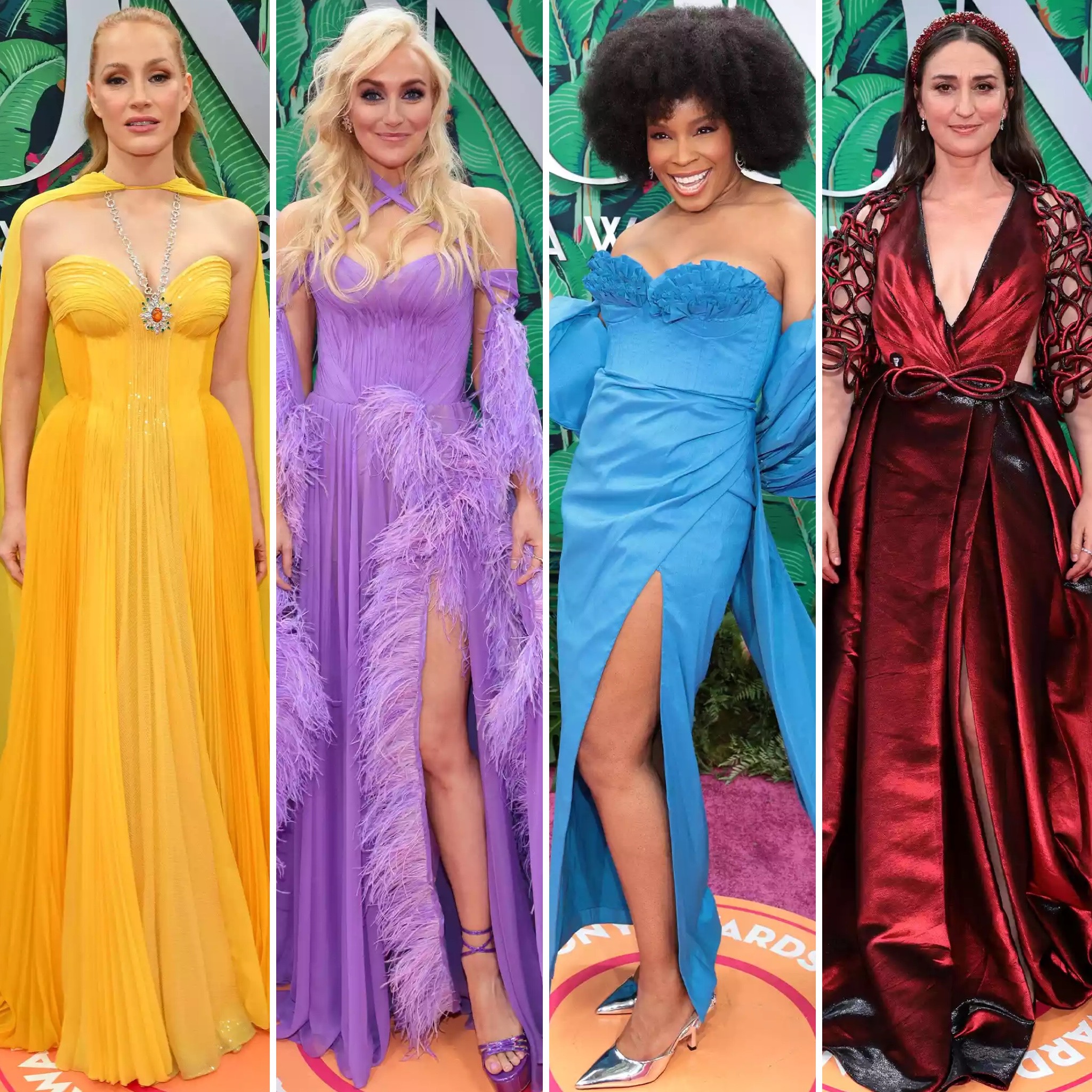 Jessica Chastain in a yellow caped Gucci gown, Betsy Wolfe in a purple feathered gown, Amber Ruffin in a blue off-the-shoulder dress, & Sara Bareilles in a ruby Georges Chakra gown at the 76th Annual Tony Awards