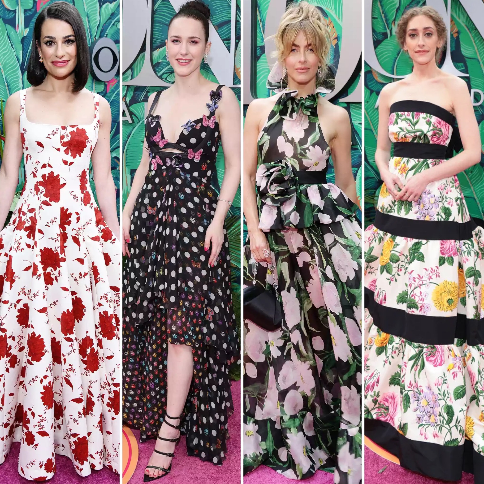 Lea Michele in a floral Emilia Wickstead ballgown, Rachel Brosnahan in a printed Dua Lipa x Versace design, Julianne Hough in a floral Carolina Herrera dress, & Michaela Diamond in a floral printed gown at the 76th Annual Tony Awards