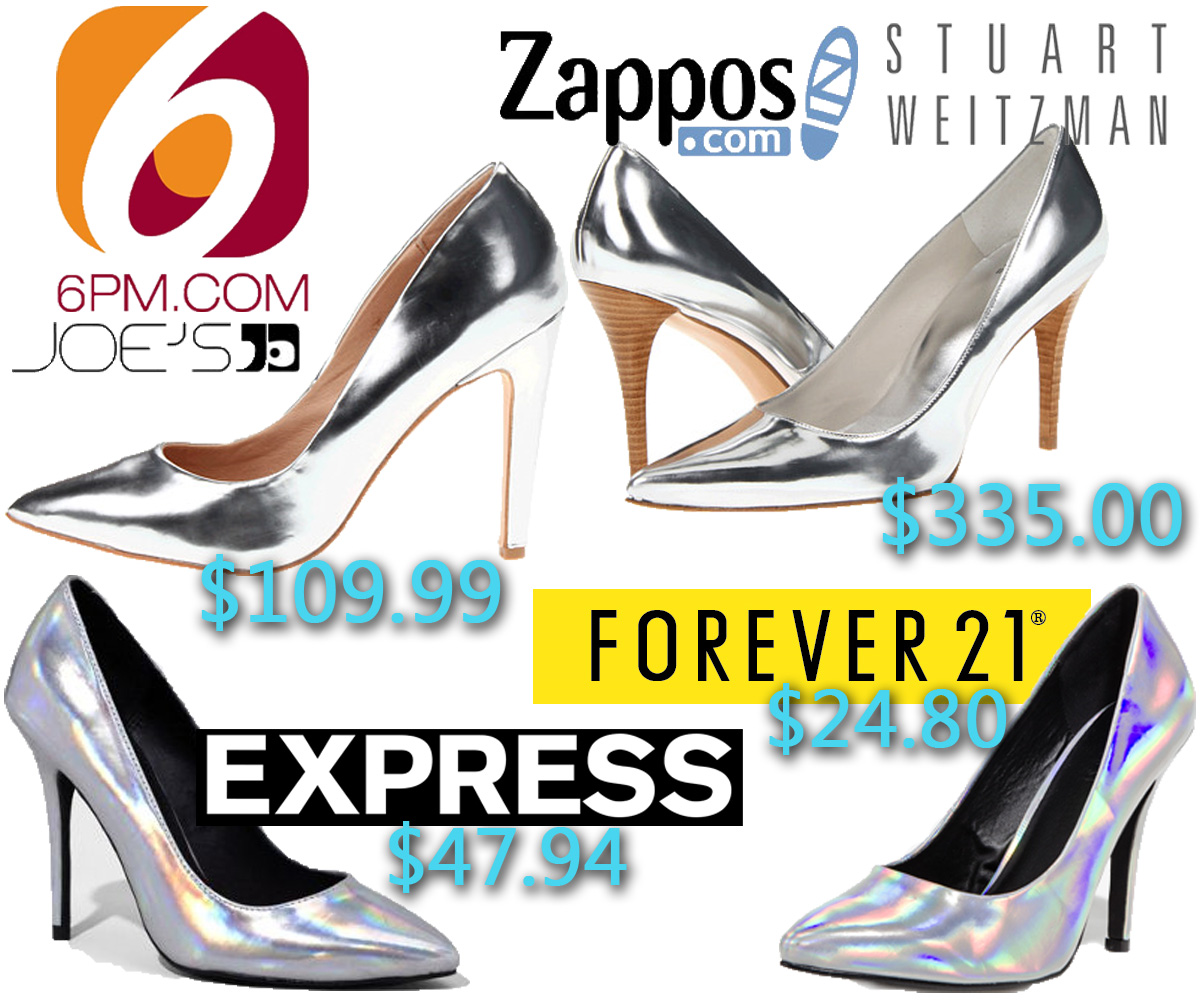 This includes the Stuart Weitzman Daisy pumps ($335.00) from Zappos, Joe’s Jeans Delores pumps ($109.99) from 6PM, the pointed toe pump ($47.94) from Express, & the most affordable are the pointed hologram pumps ($24.80) from Forever 21. All of these are sexy additions to upgrade a jeans & blouse look for day, modernize a lace LBD, or satin shorts & a blazer for a night out with the girls.