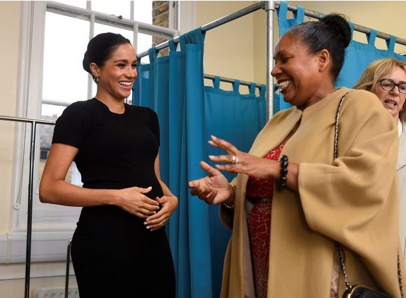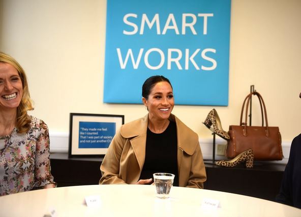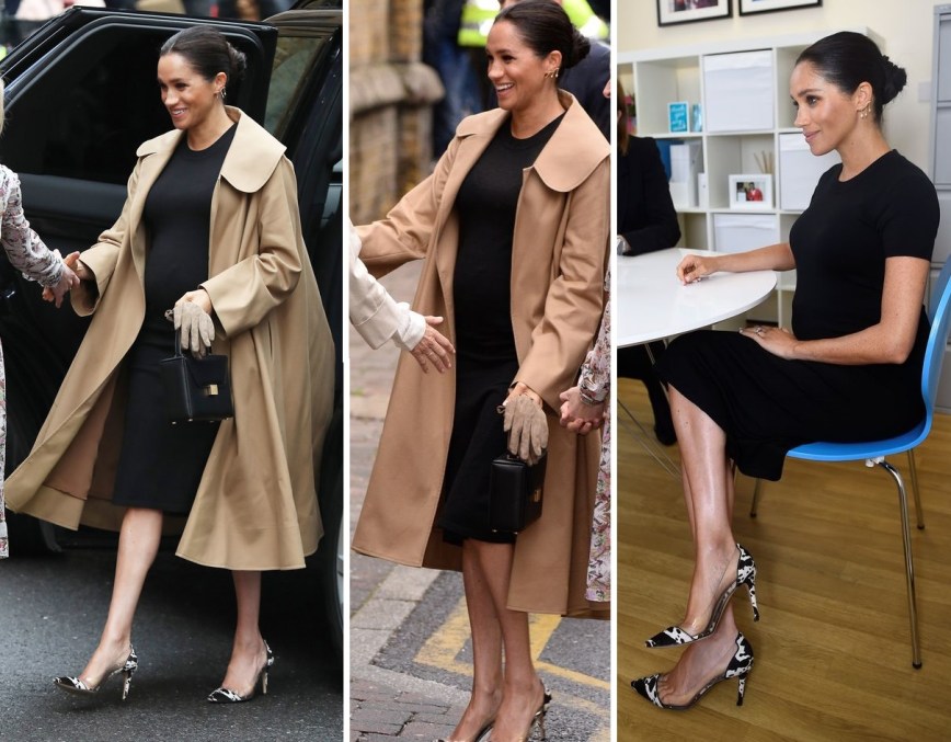 The Duchess of Sussex, Meghan Markle, made her first patronage to work with the charity organization, Smart Works, that works with women who are seeking to improve their job pursuits (via interview skills & wardrobe choices). The mother-to-be arrived in a black materntiy t-shirt dress by Hatch & Oscar de la Renta coat with a Victoria Beckham purse & cow print heels.