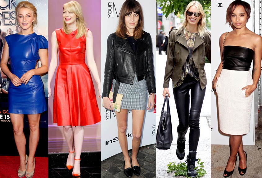 Instead of posting yet another click-worthy gallery, I’ve selected these five outstanding red carpet looks, worn recently by some of my favorite celebrities. Each of them are showing how leather isn’t just a material for the cooler months. The sexy skin is also no longer just for jacket & bags, as seen in these above photos. Designers are all about texture this season, showing leather off in all sorts of articles of clothing. This includes dresses, as most frequently seen on the likes of rivaling stars like Angelina Jolie & Jennifer Aniston, but here I’m featuring Rock of Ages actress Julianne Hough in a blue leather dress at the film’s premiere & the always adorable Emma Stone in a red frock by Monique Lhuillier for an appearance on The Tonight Show with Jay Leno.