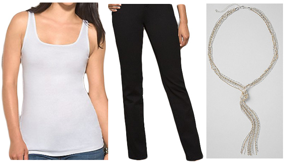 The ingredients for Jennifer’s look are easy to put together: white tank, black skinny jeans, & a gold knotted, tassel necklace. Here are three sources to recreate this outfit for the budget-minded shopper of any size because you shouldn’t have to sacrifice your entire income for your style.