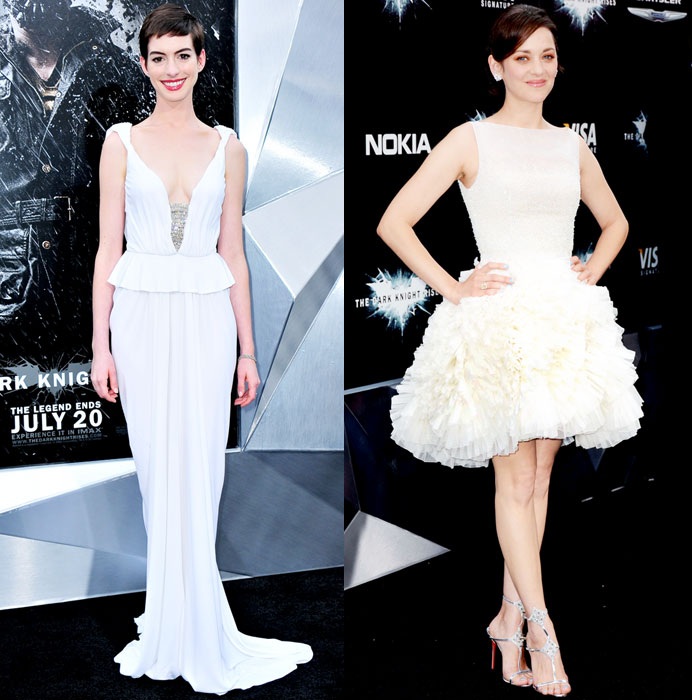 At the New York premiere of the highly anticipated The Dark Knight Rises, leading ladies Anne Hathaway & Marion Cotillard stepped out in style, wearing white dresses worth talking about! Anne is donning a plunging white hand-draped Prabal Gurung gown with diamond Kwiat jewelry. The simplicity of the gown nicely offsets her new cropped ‘do, not to mention that white has always looked gorgeous on the Oscar nominee. Also, French actress Marion is wearing a cocktail dress by Dior, with Chopard jewelry & strappy Christian Louboutins. Both brunette beauties are turning head & I can’t wait to see what else they’ll be wearing as the film premieres around the world. Happy Styling!