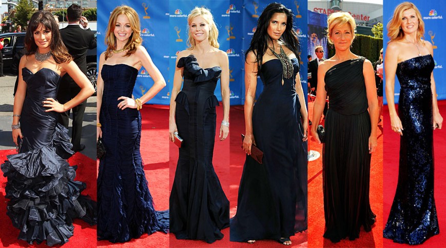 An equally regal & stunning choice was navy on the red carpet.  Lea Michele told Ryan Seacrest that she hadn’t worn blue lately & it reminded her of the summer midnight sky.  The romantically decadent color was found in all shapes with dramatic ruffles, ruching, & Grecian draping.  My favorite picks for navy are Lea Michele in Oscar de la Renta, Jayma Mays in Burberry Prorsum, Julie Bowen in J. Mendel, Padma Lakshmi in Marchesa, Edie Falco, & Connie Britton: